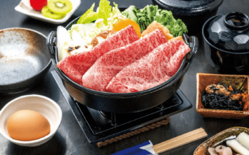 純近江安田牛上すき焼き[ロース] / すき焼きお野菜 / 小鉢 / 近江米ご飯 / お味噌汁 / 香物 / デザート